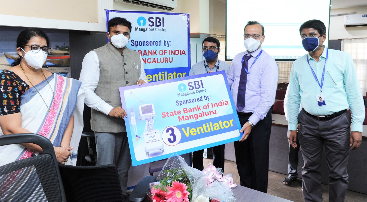 Rajesh Gupta, Deputy General Manager, SBI, Mangaluru Zonal office, Harishankar, Regional Manager, SBI and Dinesh U chief Manager, SBI handing over ventilators symbolically to Dakshina Kannada Deputy Commissioner Dr K V Rajendra and ADC M J Roopa on Thursday.