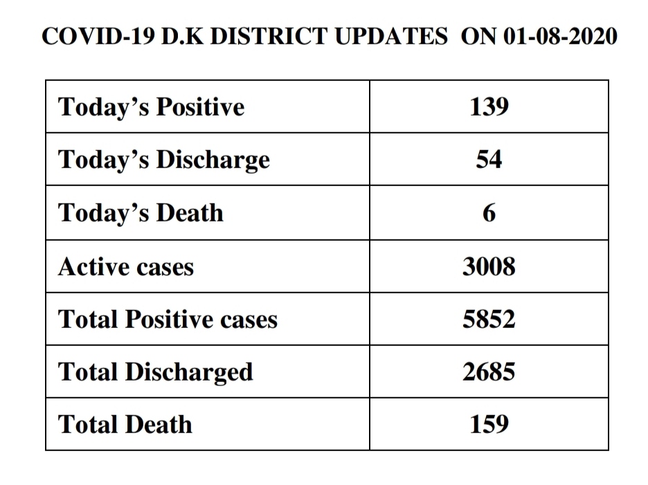 Mangaluru, Aug 01: Dakshina Kannada recorded 139 cases and six deaths on Saturday.