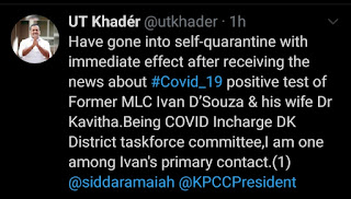 “Have gone into self-quarantine with immediate effect after receiving the news about COVID-19 positive test of Former MLC Ivan D’Souza and his wife Dr. Kavitha,” Khader tweeted.