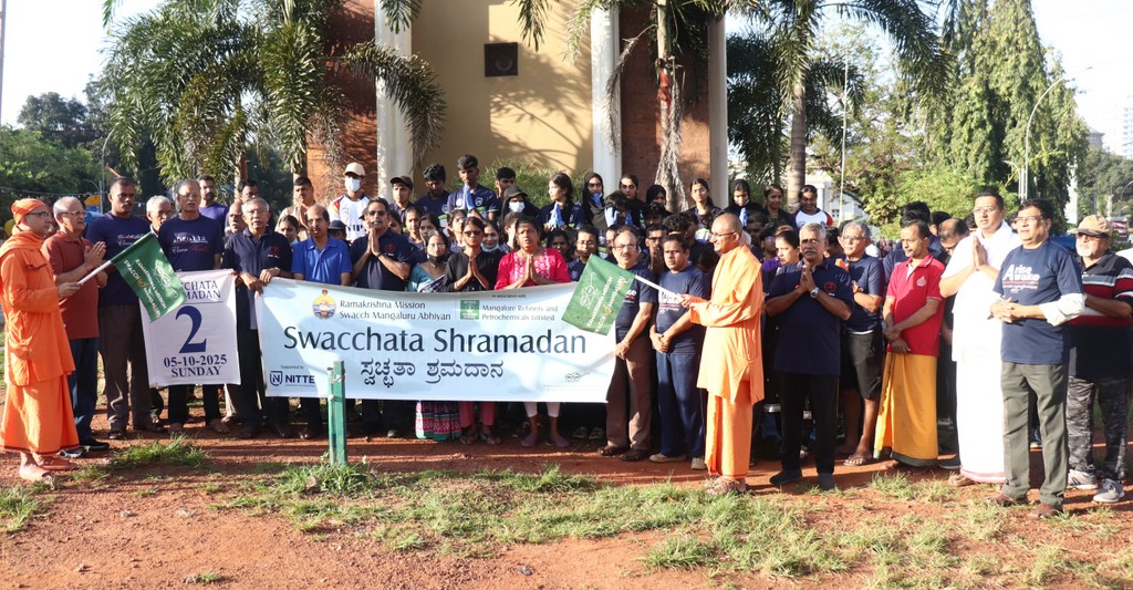 Mangaluru, Oct 05, 2025: The area around the city’s Clock Tower turned into a hub of activity as the October Shramadan of the Ramakrishna Mission’s Swacch Mangaluru Abhiyan was held with enthusiastic participation from volunteers. Swami Vidyamrutanandaji of Ramakrishna Mission Sarada Peeth, Kolkata, and Swami Yugeshananda of Ramakrishna Math, Mangaluru, jointly flagged off the cleanliness drive with a green signal.