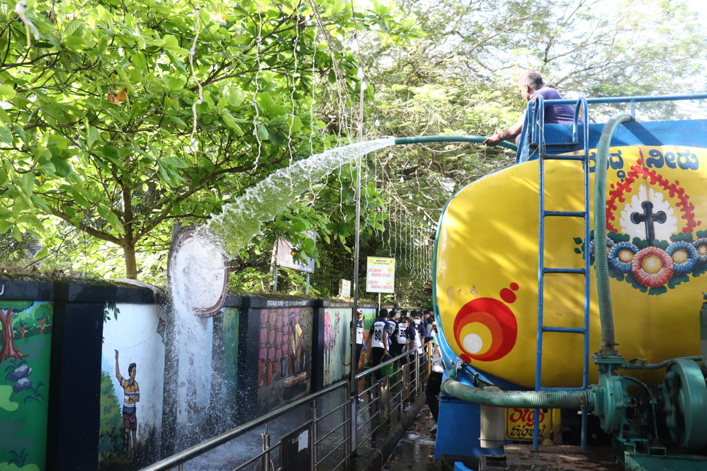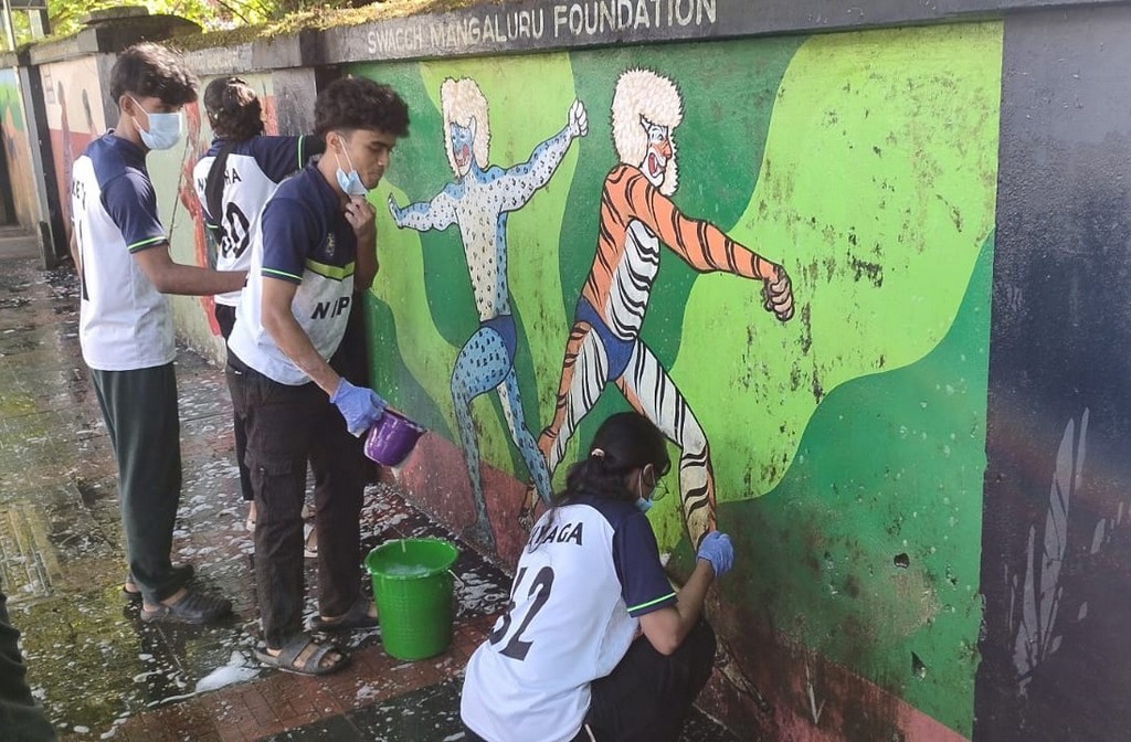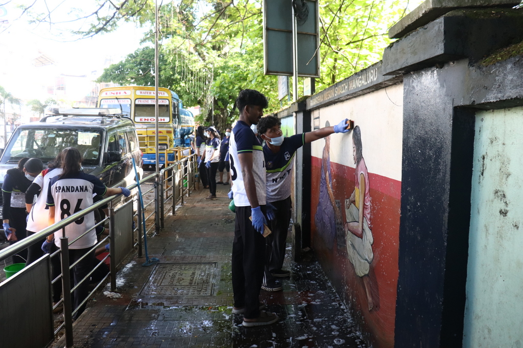 Adding a vibrant touch to the day’s effort, students from Nitte Institute of Physiotherapy, under the guidance of Dr. Dhanesh Kumar and Dr. Ruchita Narsiya, cleaned the wall murals along the University College compound. The students removed weeds, trimmed overhanging branches, and washed the murals to remove algae and dirt. With the help of a water tanker, the paintings were restored to their original brightness.